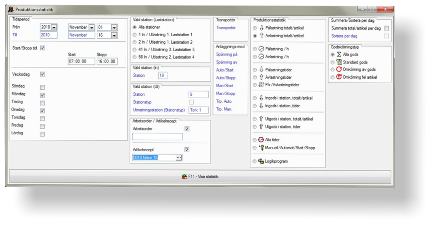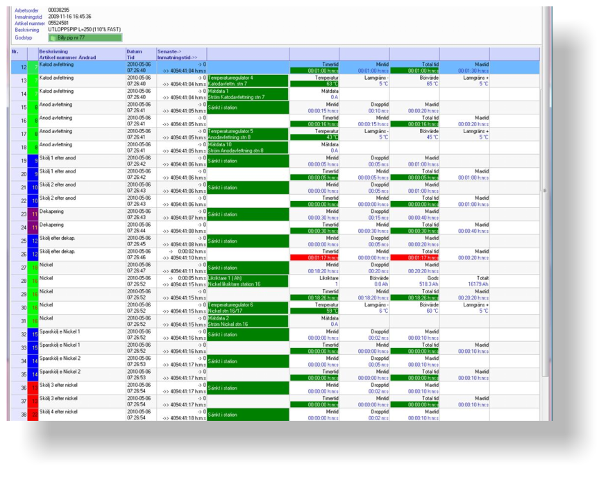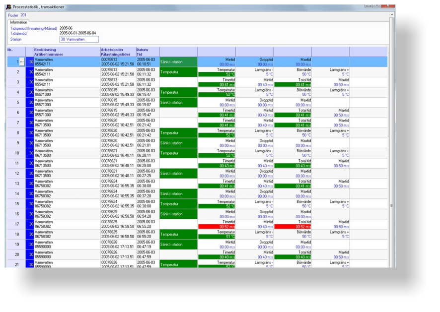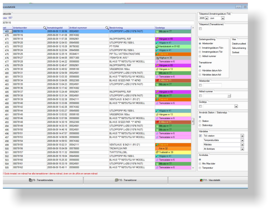 Processtatistik som visar processgången för godset, alla tider, spänningar,