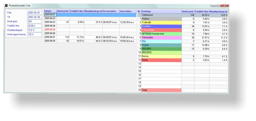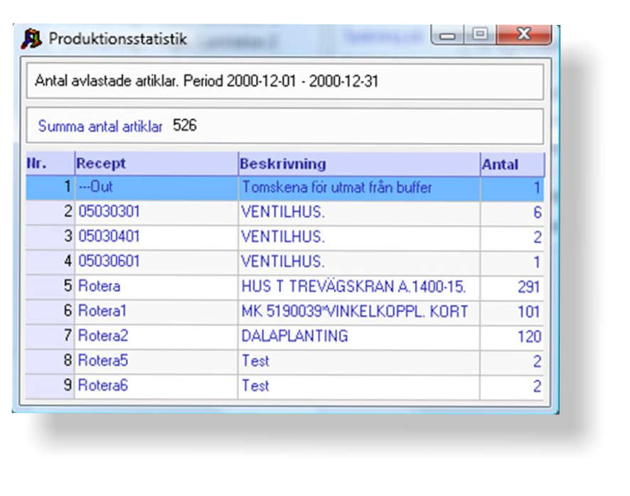 Produktionsstatistik för antal producerade artiklar, antal omkörningar,